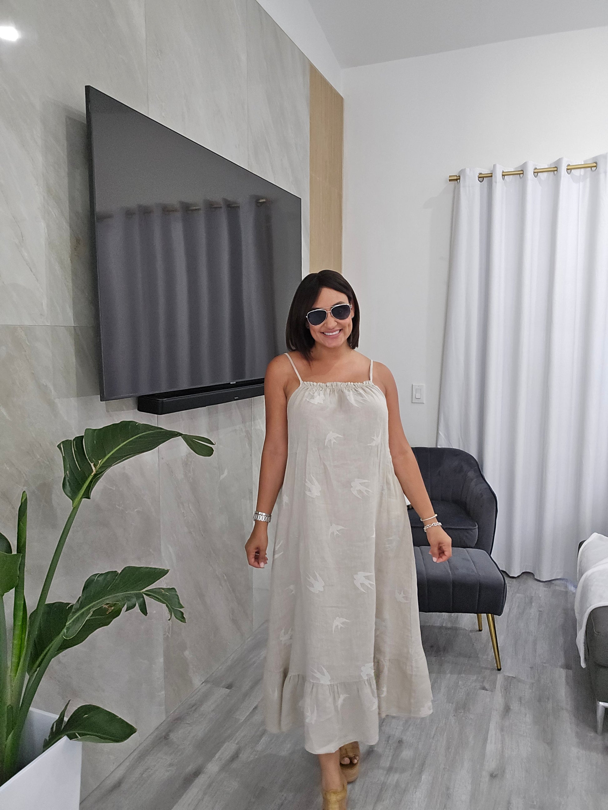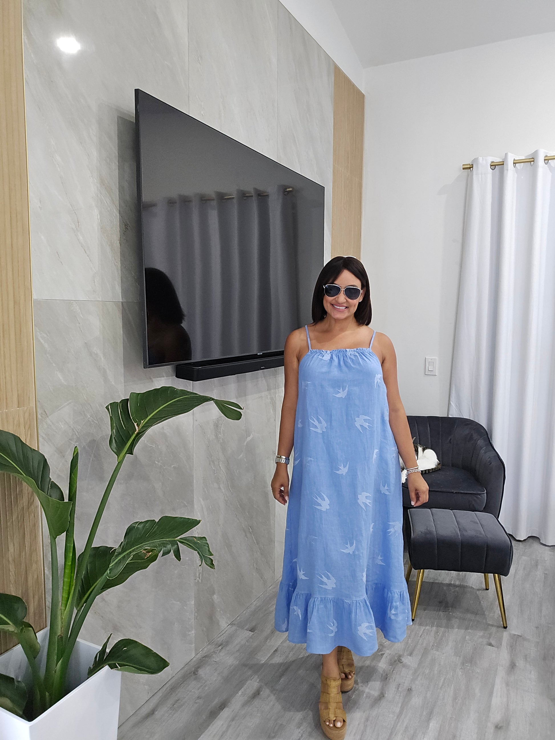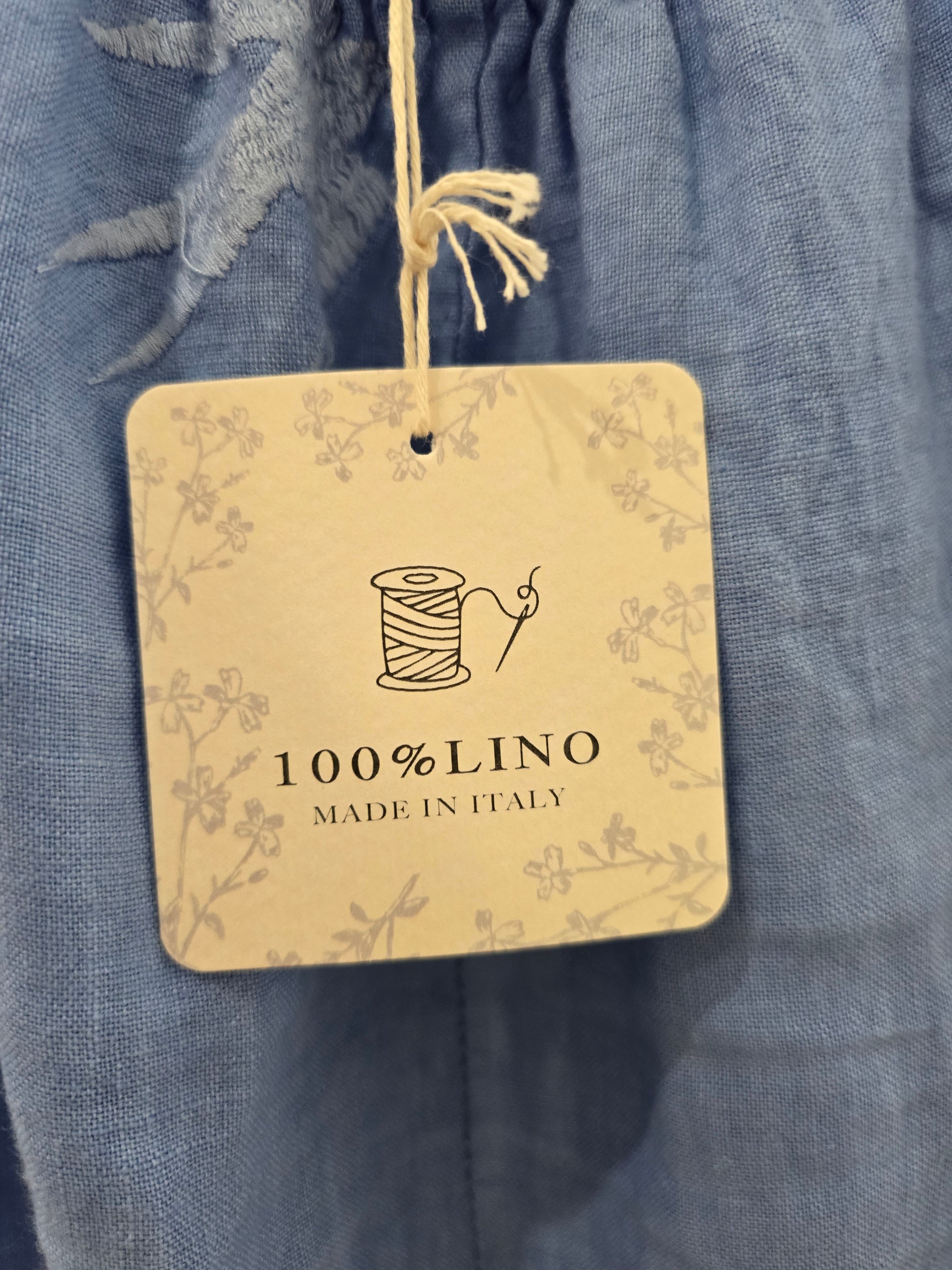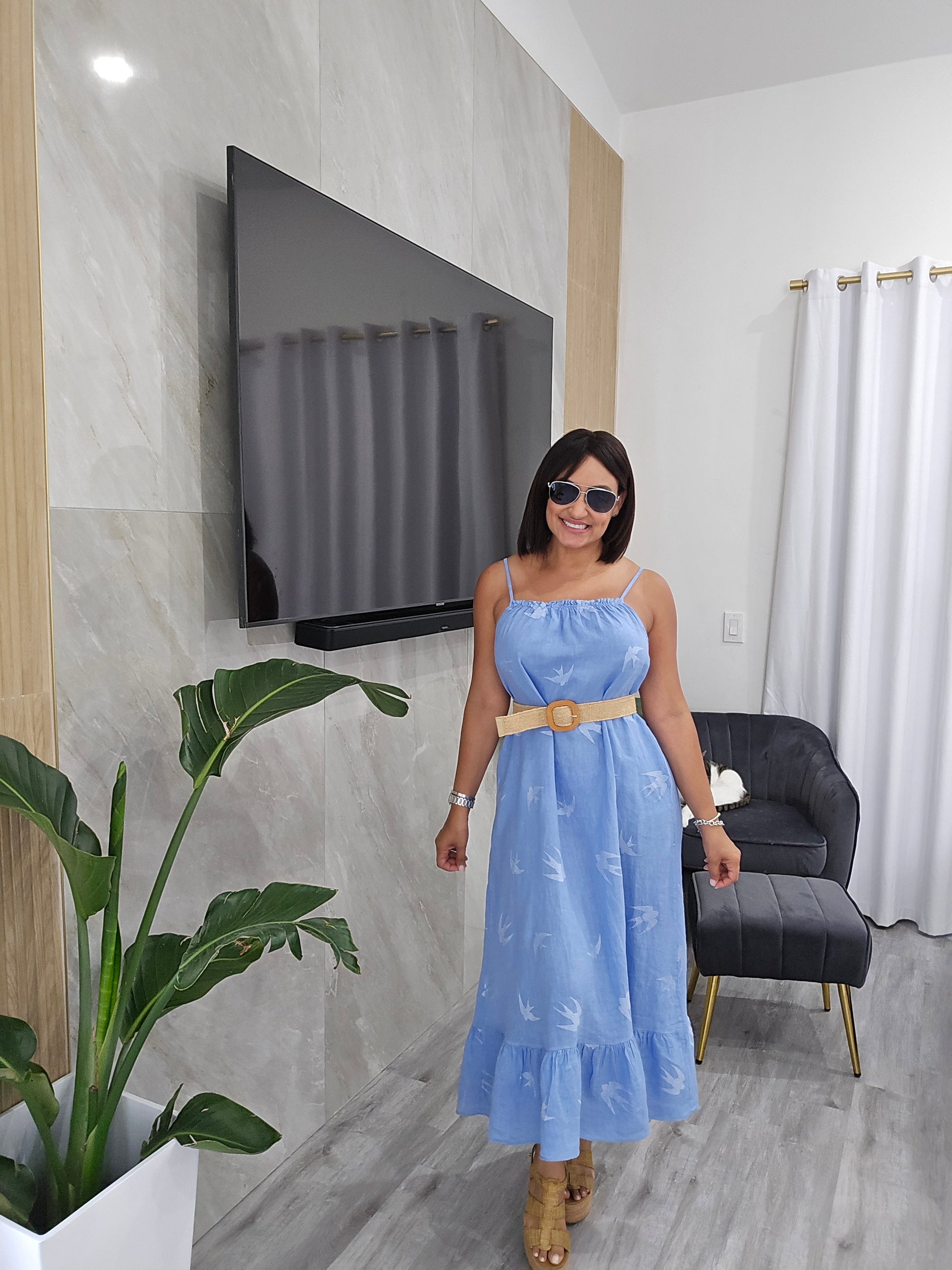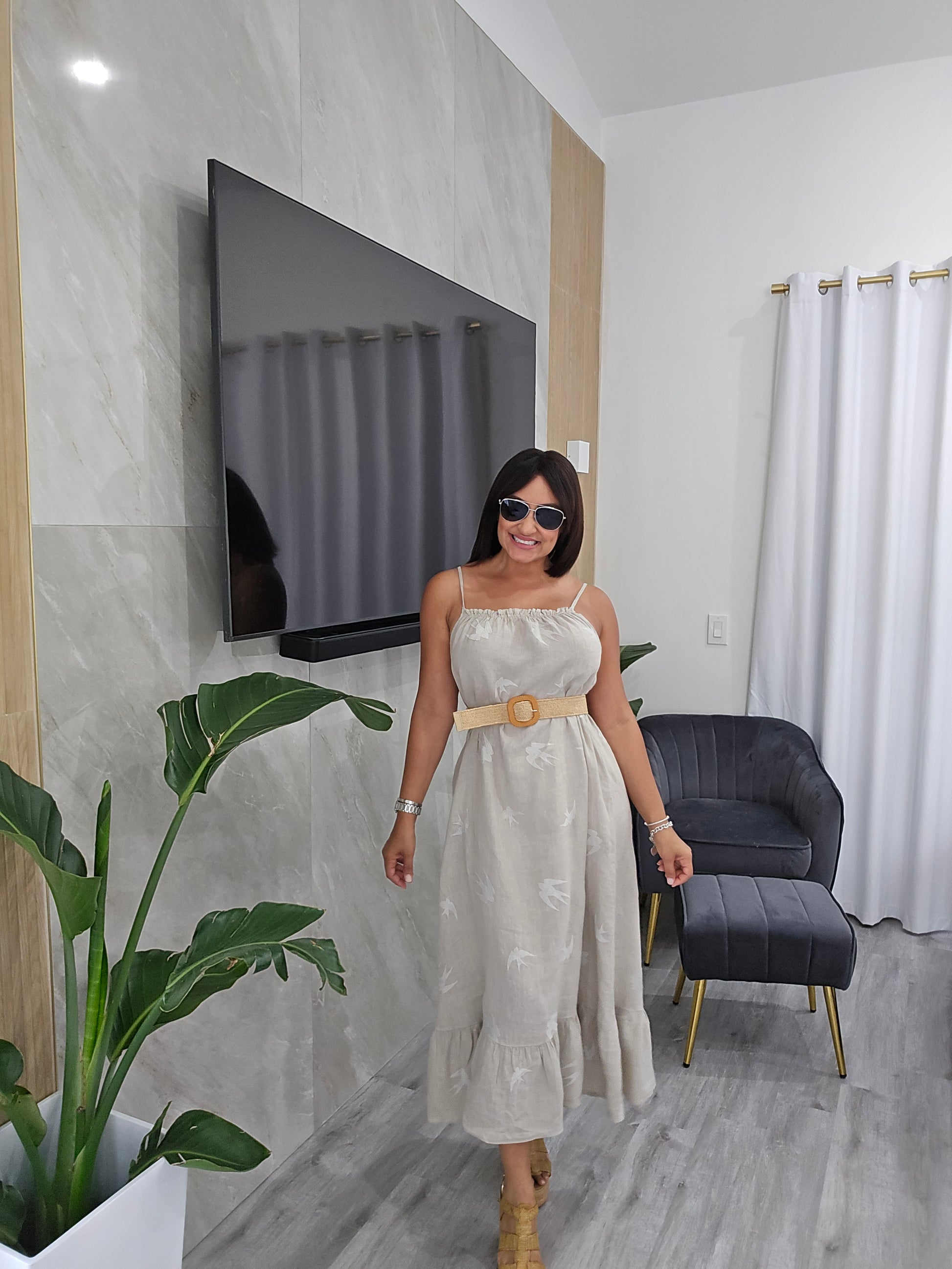 Strap linen maxi dress. Embroidery designs around the dress. Dress could be used with belt or without belt for a loose fit. (Belt not included).Dress has a ruffle at the button. Dress is 100% Italian ๐ฎ๐น linen.ย